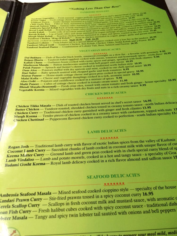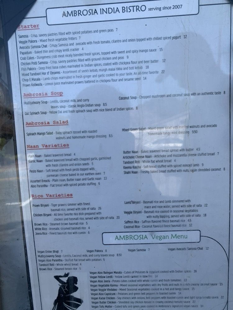 Ambrosia India Bistro - Monterey offers a unique Indian dining experience in Monterey. With a range of vegan and vegetarian options, the menu caters to all preferences. Customers have praised the delicious flavors of the food, such as the butter chicken and chicken biryani. The garlic naan is also a standout favorite. The restaurant's ambiance, including outdoor seating with a waterfall, adds to the dining experience. While some patrons have noted occasional confusion with service, the overall experience is positive. The staff is courteous, and the food is served hot and promptly. Whether you're looking for a casual lunch or a more formal dinner, Ambrosia India Bistro - Monterey is a fantastic choice for authentic Indian cuisine in a welcoming atmosphere.
